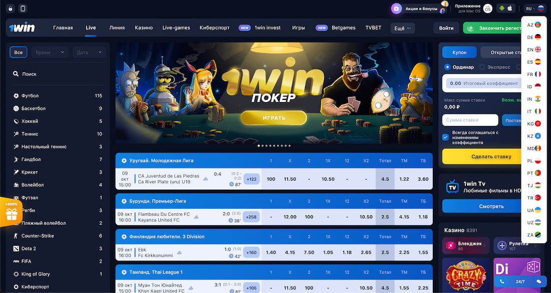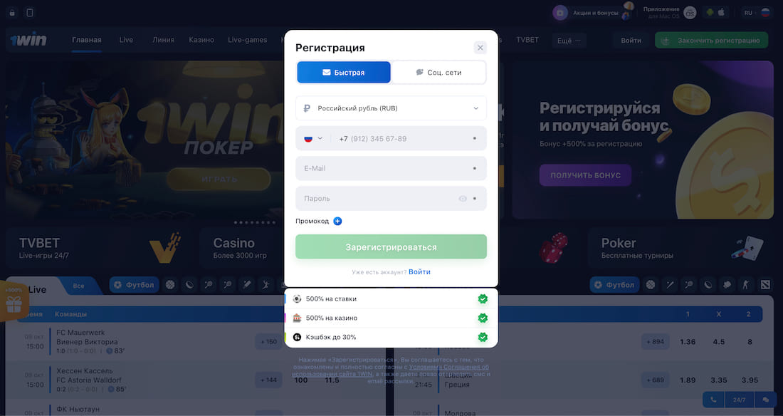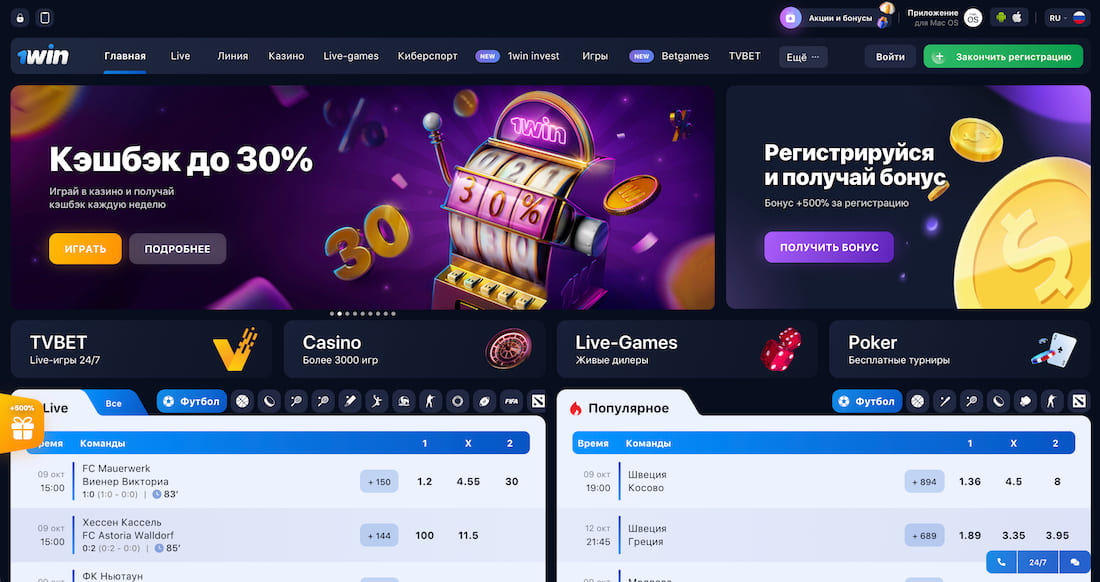 Если у вас нет личного аккаунта, зарегистрируйтесь. Вы получите доступ ко всем возможностям БК 1Вин: беттинг, слоты, транзакции и щедрые награды. Стратегия поощрений включают: бонус за регистрацию (500%), фриспины и фрибеты за баллы, рейкбеки и кэшбеки, турниры и акции. Вы можете включить бесплатную трансляцию матчей и любимых фильмов.